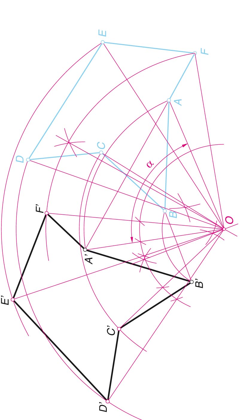El ángulo es AOA' = alfa. Este ángulo se transporta a partir de cada línea de unión entre los puntos y el centro del giro para conseguir la figura.