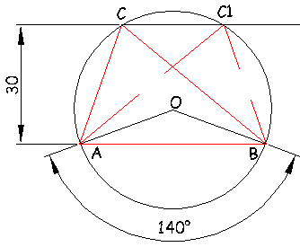 2 – Dibujar un triángulo isósceles dentro de la circunferencia de tal manera que el ángulo desigual sea de 140º y tenga el vértice en el centro. Los lados iguales deben tener la misma medida que el radio.